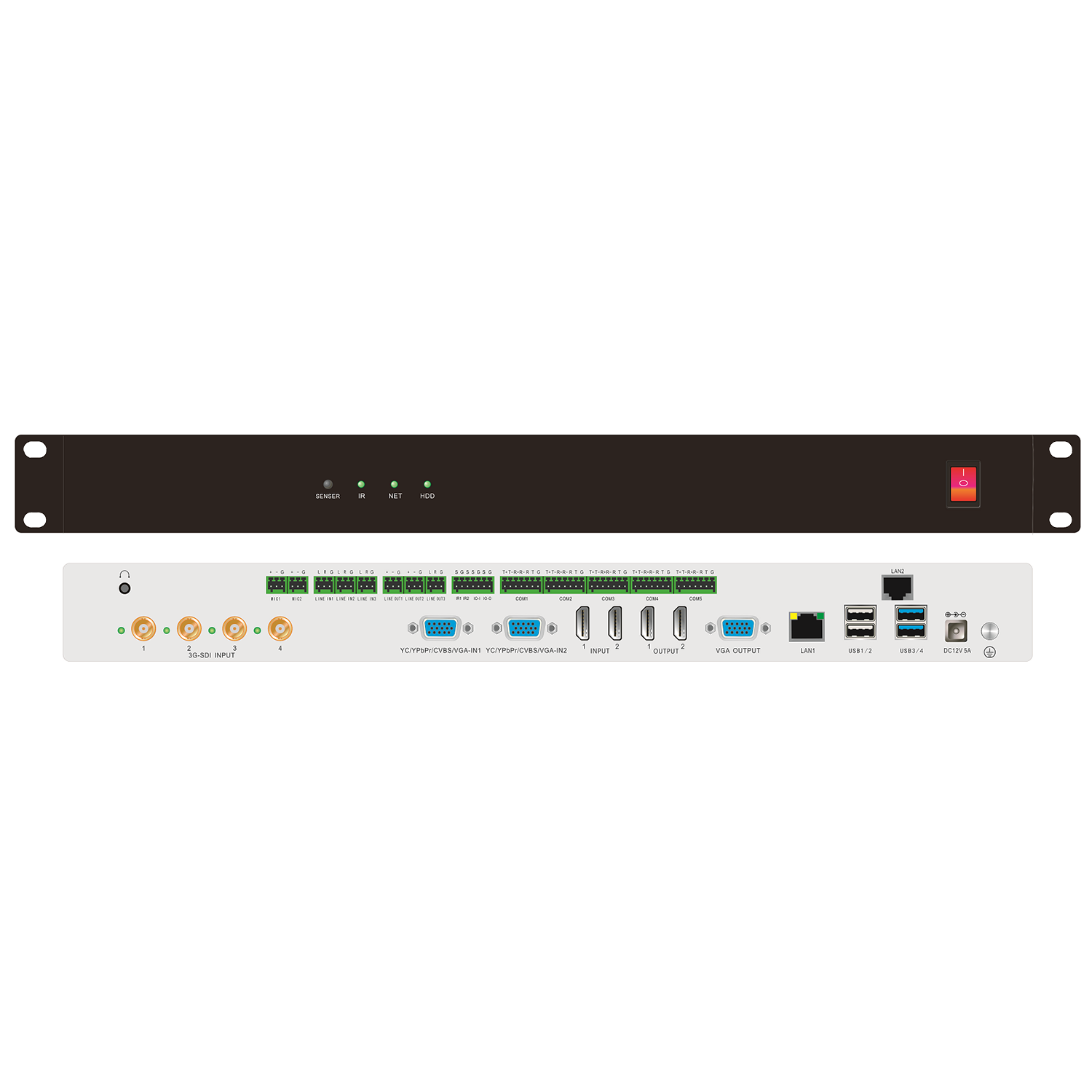 視頻輸入輸出 | 輸入:4路SDI+2路VGA+2路HDMI共8路 輸出:2路HDMI+1路VGA共3路高清輸出 | √ |