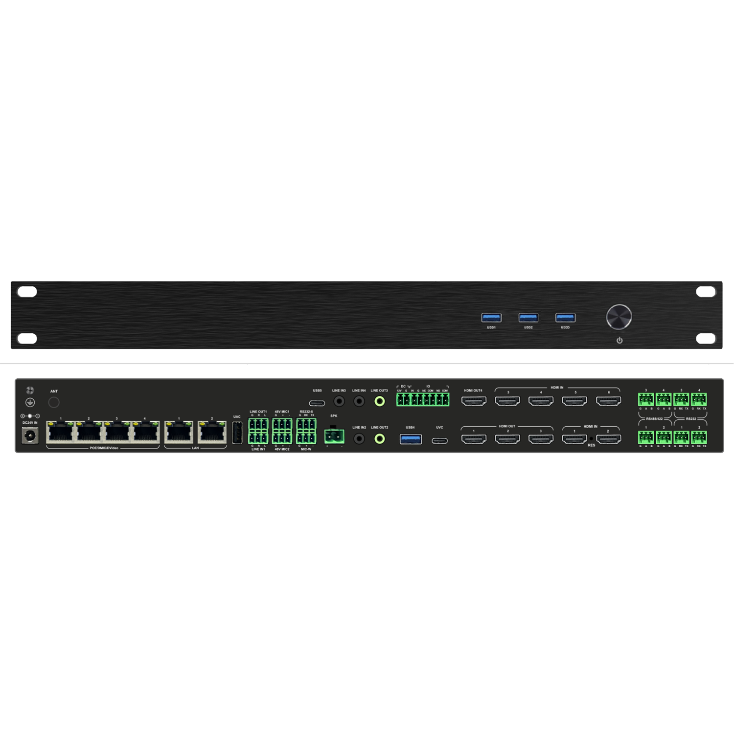 音頻輸出 | 4路HDMI OUT、1路SPK OUT、1路UAC音頻輸出、2路3.5mm插孔LINE OUT、1路鳳凰端子LINE OUT |